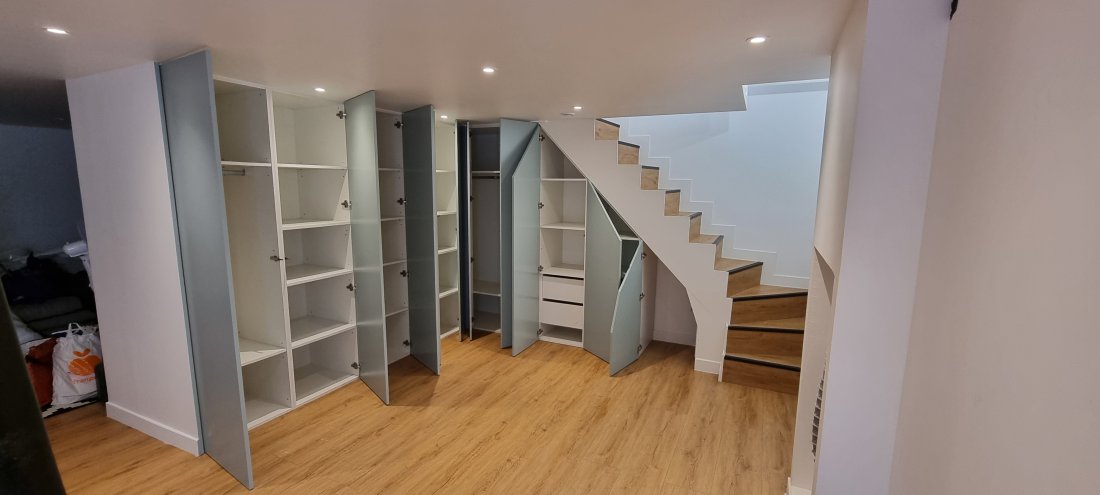 Sur ce projet, la problématique principale résidait dans l’optimisation d’un espace restreint, tout en respectant les contraintes architecturales existantes, telles que les angles atypiques ou la présence de moulures. Il fallait aussi tenir compte de la fluidité de circulation, du choix des matériaux pour garantir la robustesse, ainsi que de l’harmonisation avec le style de la pièce. Notre intervention a ainsi permis de transformer un espace sous-exploité en un rangement esthétique, pratique et parfaitement adapté aux habitudes de vie du client.