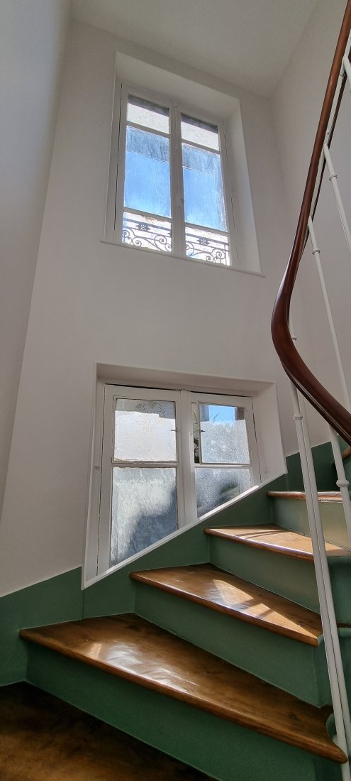 Photo illustrant la rénovation d'une cage d'escalier : murs parfaitement repeints, escaliers remis à neuf, ambiance propre et moderne grâce à l'expertise CLEAN CONCEPT.