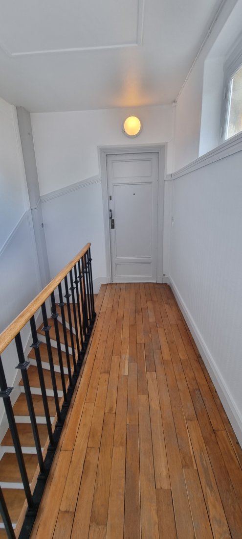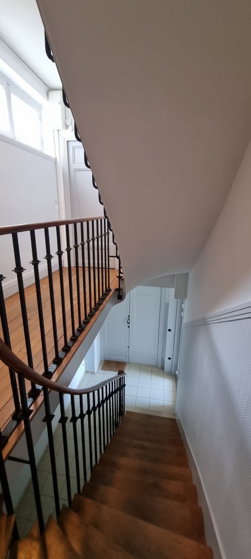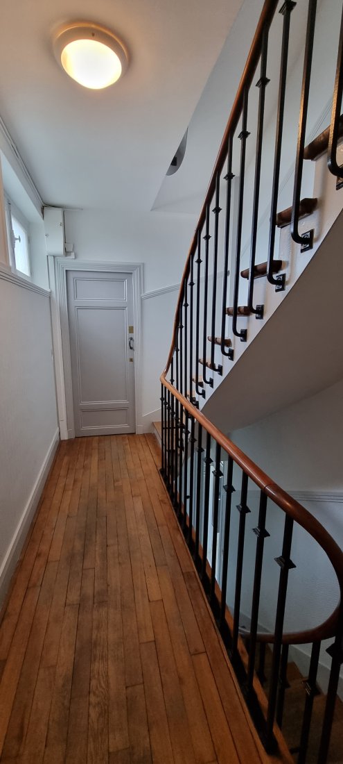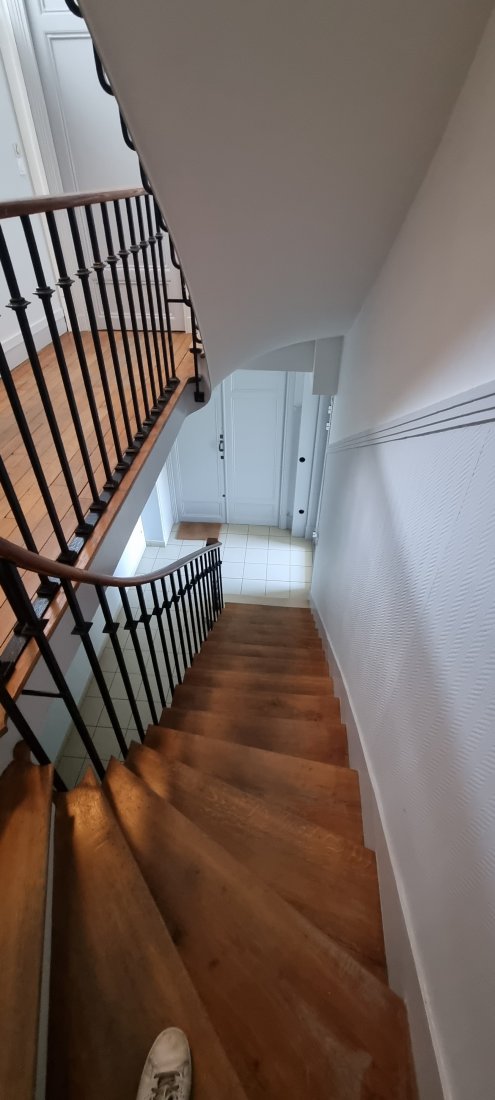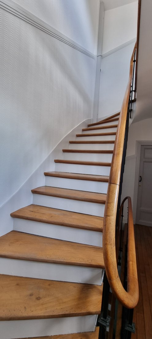 Cage d’escalier fraîchement rénovée dans un immeuble typique du Vésinet : murs repeints, rambarde restaurée et sols impeccables, reflétant le savoir-faire de CLEAN CONCEPT pour un cadre accueillant et soigné.